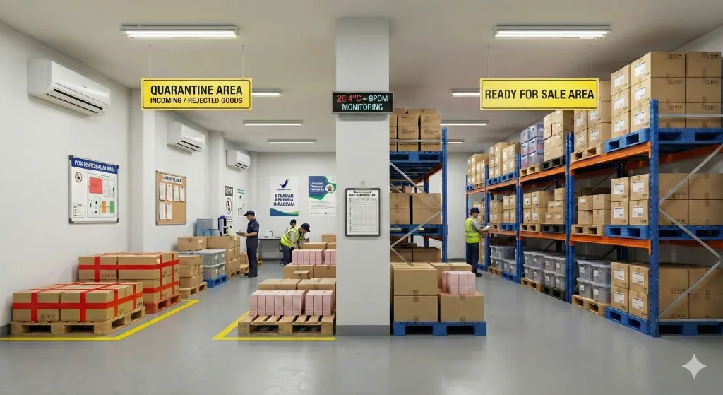 - Segregation: There must be a clear physical separation between “Quarantine Area” (for incoming/rejected goods) and “Ready for Sale Area”.