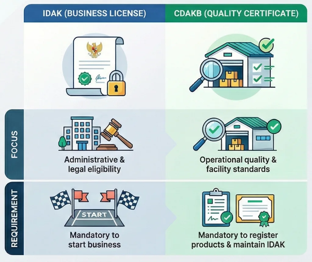 | Feature | IDAK (Izin Distribusi Alat Kesehatan) | CDAKB (Cara Distribusi Alat Kesehatan yang Baik) |