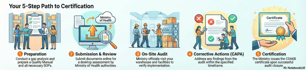 - Penerbitan: Kementerian menerbitkan sertifikat CDAKB setelah penutupan CAPA yang berhasil.